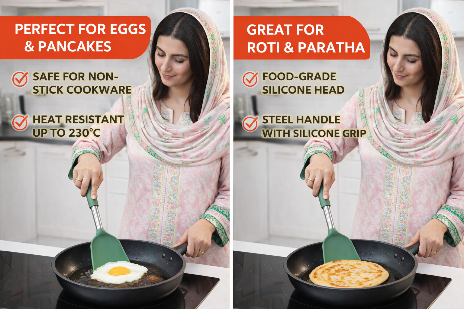 Upgrade your kitchen with this premium heat resistant silicone spatula turner designed for everyday cooking. The wide flat head easily slides under eggs, pancakes, roti, paratha, and steaks for smooth lifting and flipping.